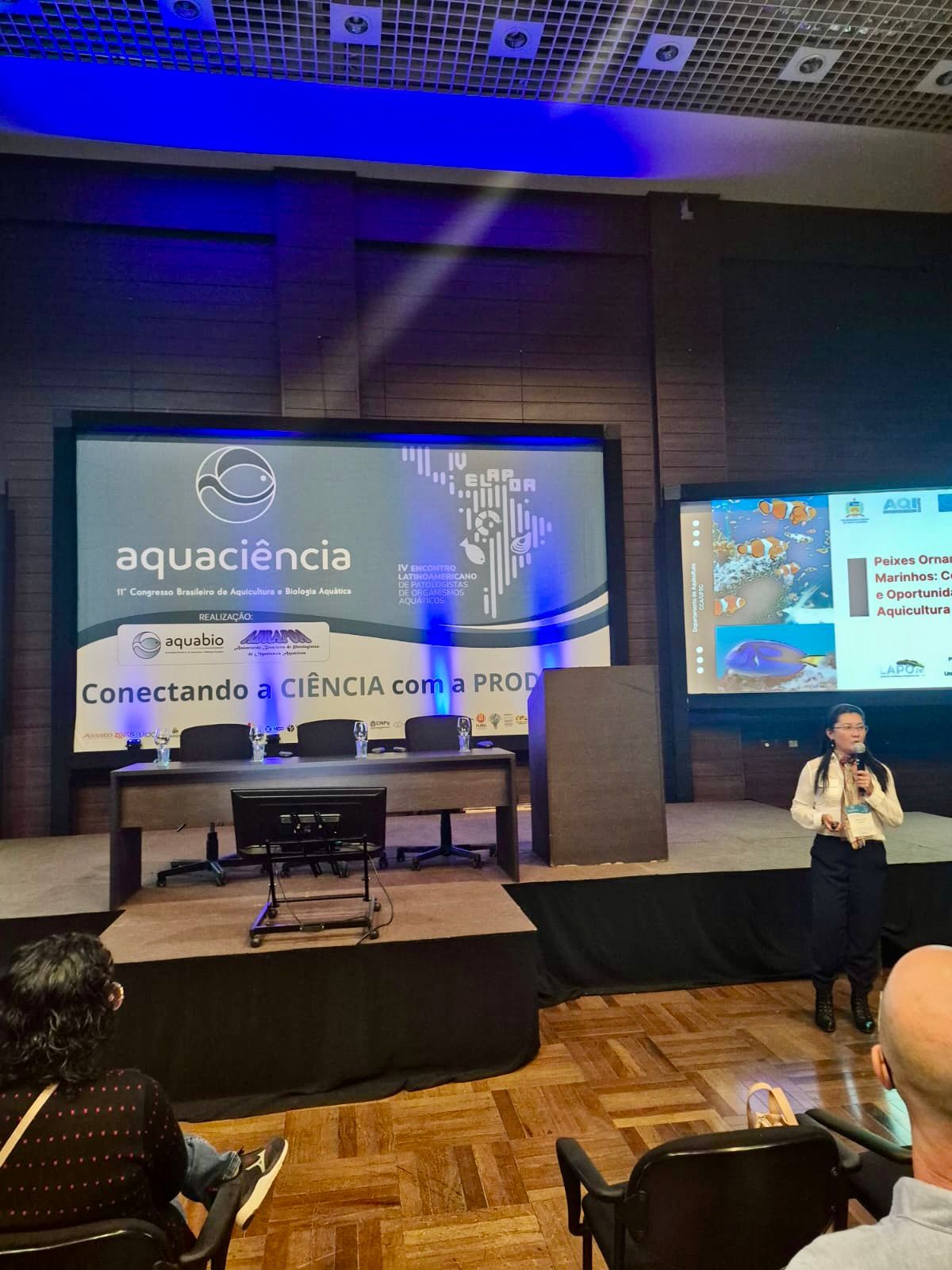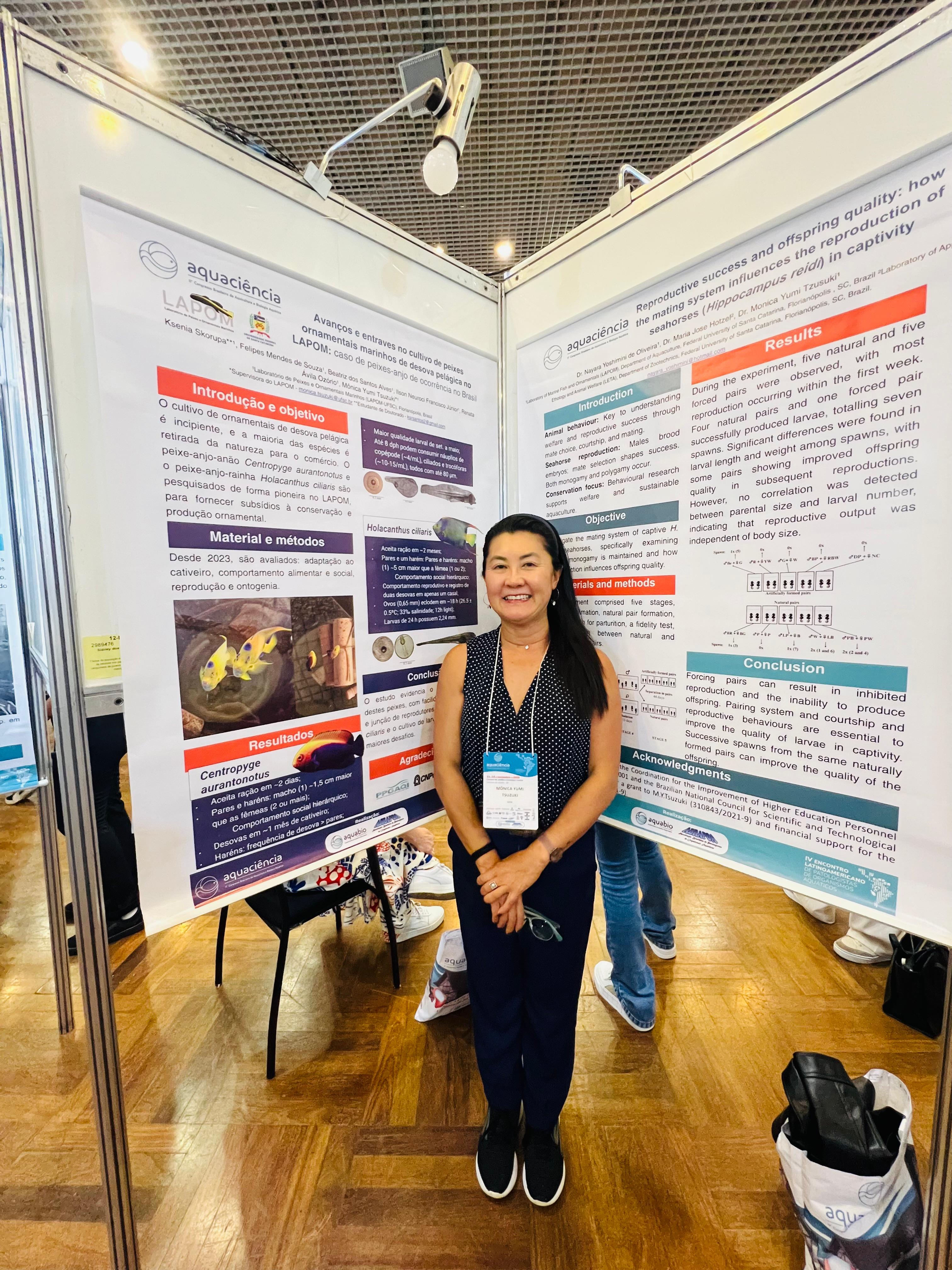 A professora Mônica Yumi Tsuzuki participou da mesa-redonda “Peixes ornamentais marinhos: conservação e oportunidades na aquicultura sustentável”, apresentando reflexões sobre os desafios e o potencial da criação sustentável de espécies marinhas ornamentais nativas, reforçando o papel da aquicultura como alternativa à captura extrativa e ressaltando o compromisso com a conservação e o manejo responsável. Além da mesa, a professora também apresentou dois banners científicos, fortalecendo a divulgação das pesquisas desenvolvidas no LAPOM/UFSC.