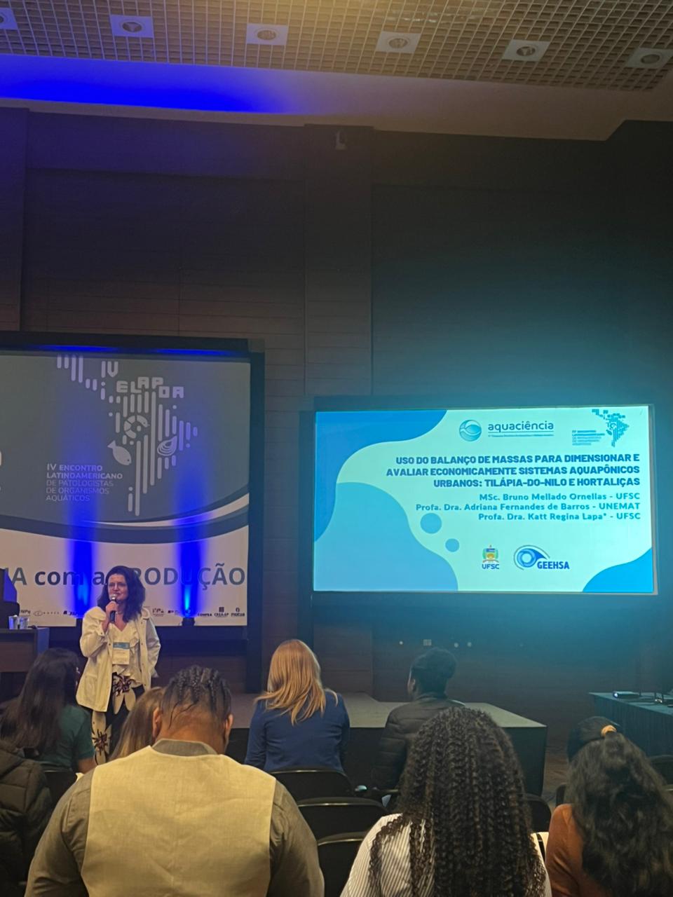 A professora Katt Regina Lapa apresentou os resultados de sua pesquisa com sistemas aquapônicos urbanos, utilizando tilápia do Nilo e hortaliças, uma proposta de produção integrada, que une piscicultura e agricultura em ambiente urbano.
